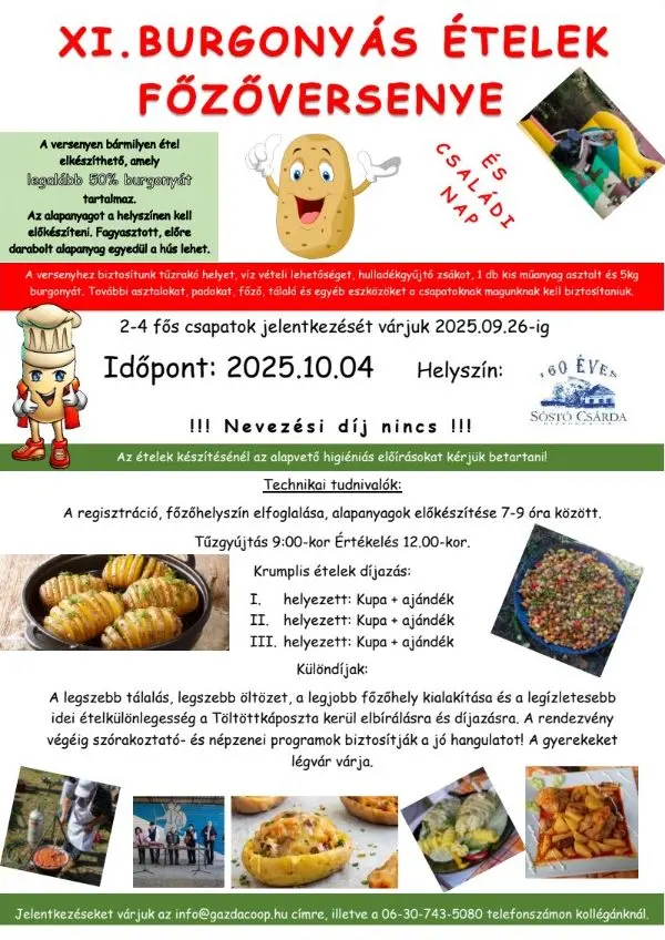 Ismételten lesz burgonyás ételek főzőversenye, melyre várják a rendezvény szervezői a jelentkezőket. A legjobbakat az idén is elismerésben részesítik. Mindenkit sok szeretettel várnak a burgonyás programsorozatra Kiskunhalasra, ahonnan senki sem fog éhesen távozni. Kellemes kikapcsolódást és jó szórakozást kívánnak minden kiérkező látogatónak a szervezők.
